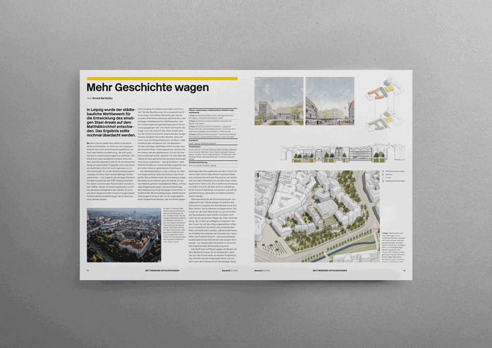 In der Bauwelt 10.2024 wird unter dem Titel "Mehr Geschichte wagen" der Wettbewerb zum Matthäikirchhof in Leipzig diskutiert.