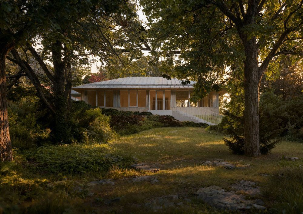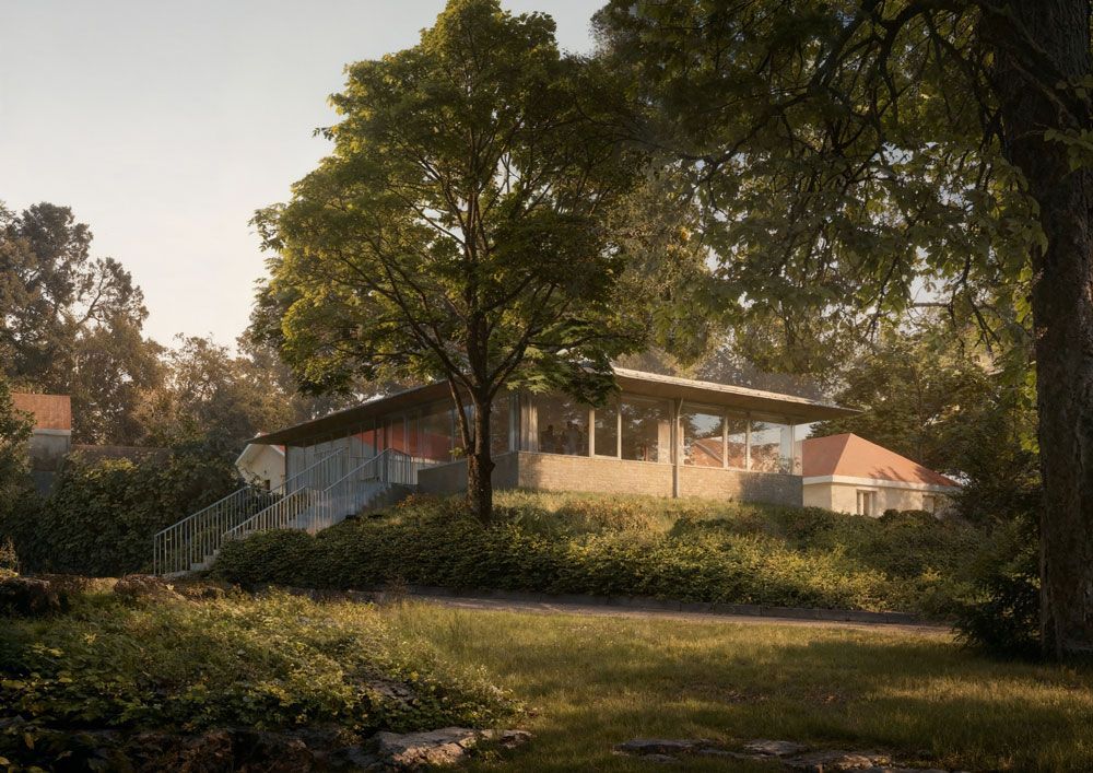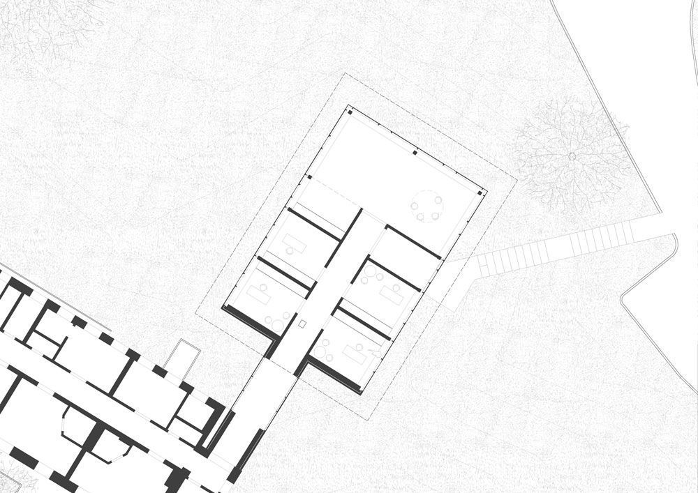 Die Verbindung zum Bestand erfolgt über einen Übergang, der eine barrierefreie Orientierung ermöglicht. Ergänzend führt eine in die Topografie integrierte Treppe über das Gelände zum eigentlichen Eingang der Erweiterung. Sie schafft eine direkte, intuitive Erschließung von außen und stärkt die Beziehung zwischen Gebäude und Landschaft.