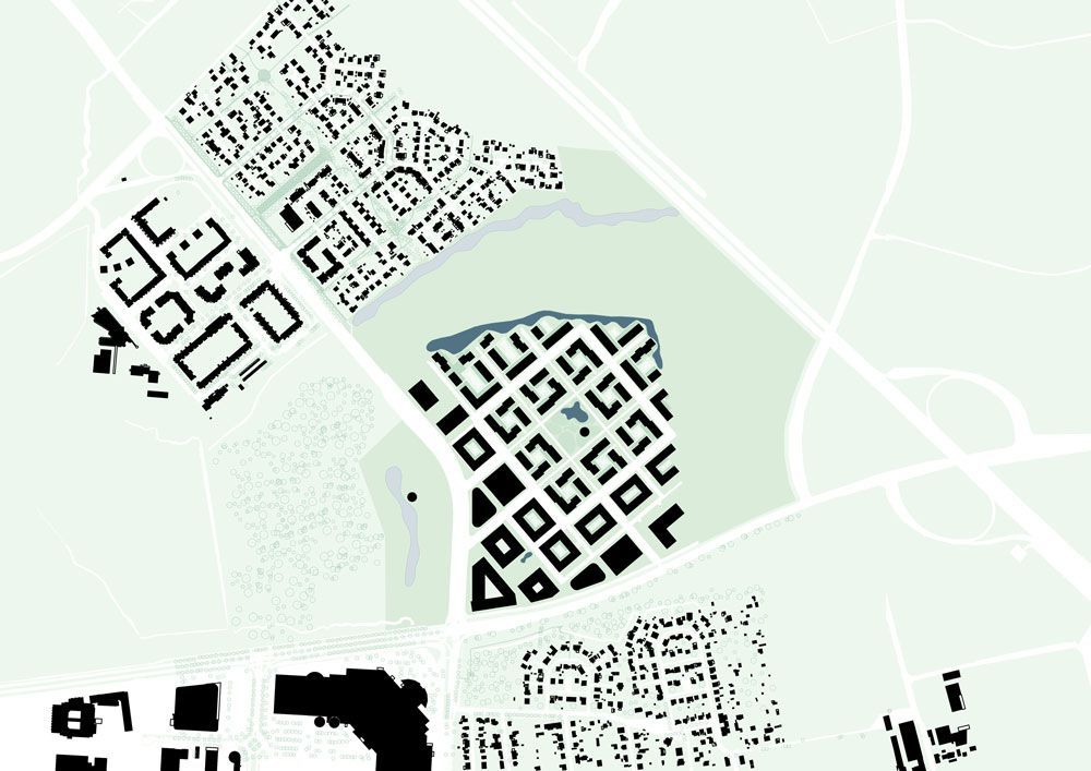 Die städtebauliche Konfiguration wurde konsequent weiterentwickelt und bildet entlang der Straße ein identitätsstiftendes Erscheinungsbild. So weisen die einzelnen Baukörper bereits hier auf die typologische Vielfalt des gesamten Quartiers hin. Die geometrische Grundstruktur des neuen Quartiers schafft im Inneren klare, aber flexible bespielbare Baufelder.