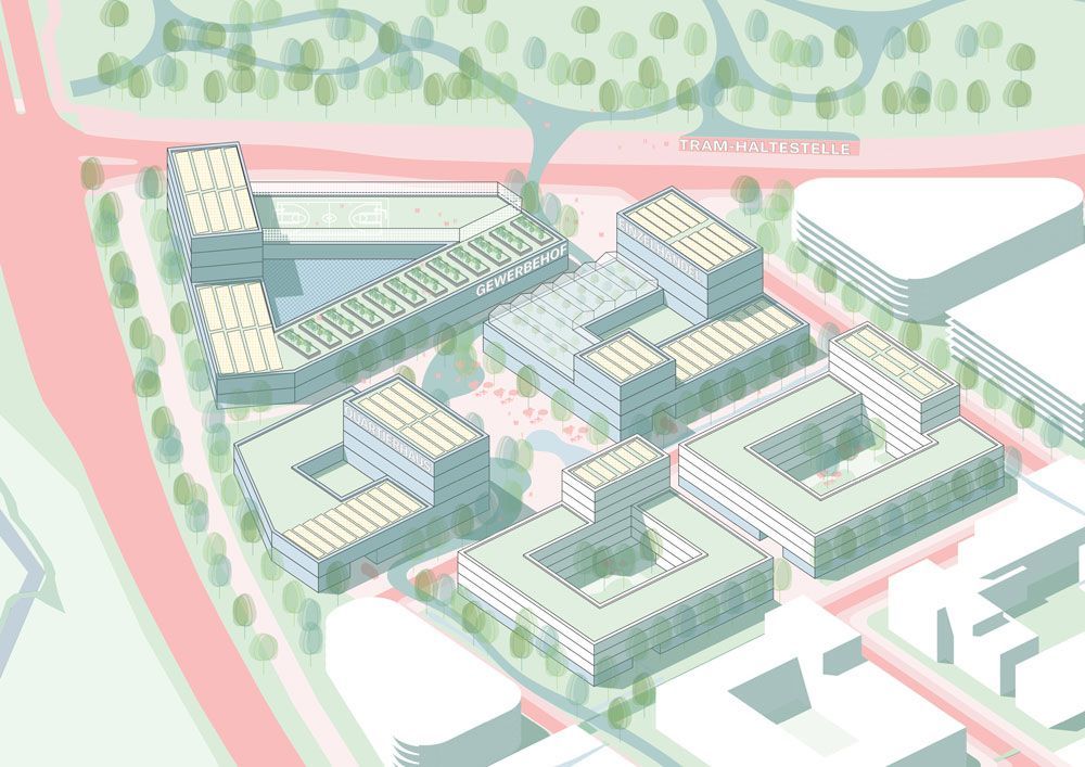 Alle neuen Straßen und Wege werden beidseitig mit Straßenbäumen zur Kühlung und Verschattung versehen. Es werden diverse, heimische Gehölze und solche, die Trockenperioden und Starkregenereignisse gut vertragen könnten, verwendet. So werden die neuen Freiflächen multifunktional genutzt – erschließend, erholend und klimatisch. Auf allen Wegeverbindungen stehen die zu Fuß Gehenden und Radfahrenden im Fokus. Neben der Erschließung ist dadurch eine hohe Aufenthaltsqualität gegeben. Überdachte und gut beleuchtete Radstellplätze, auch für Lastenräder und mit Ladestationen für Pedelecs, befinden sich dezentral im Quartier, in den Sockelzonen und an öffentlichen Plätzen. Die Grünstruktur gliedert sich in private, gemeinschaftliche und öffentliche Grünflächen. Jede Wohneinheit erhält einen Balkon oder Dachgarten. Neben den Dachgärten erhalten die Dächer Photovoltaikanlagen zur Stromproduktion. Zusätzlich gibt es gemeinschaftliche Gärten auf Dächern und in den Innenhöfen. Hier können nach Bedarf eigene Parzellen angelegt und genutzt werden oder sie werden pflegeleicht mit heimischen Gehölzen und Wiesenansaat versehen. Dadurch werden nachbarschaftliche Aktivitäten gefördert.