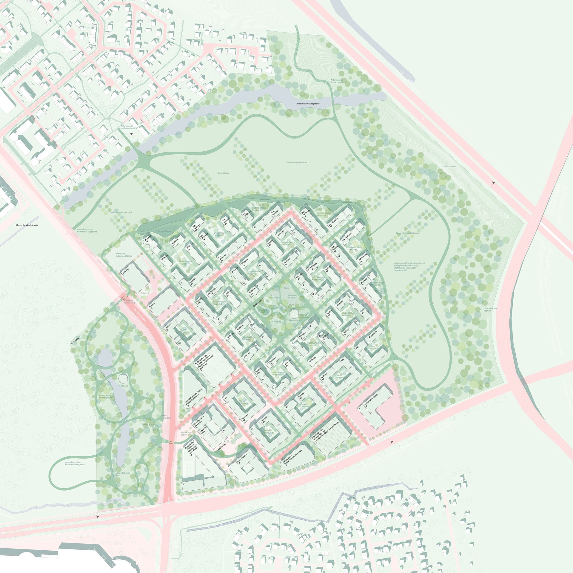 Ein grüner Ring zieht sich durch das Quartier und verknüpft dieses mit der umliegenden Landschaft. Dadurch wird die Landschaft ins Quartier gezogen und prägt dieses durch seinen grünen Charakter.