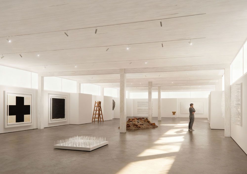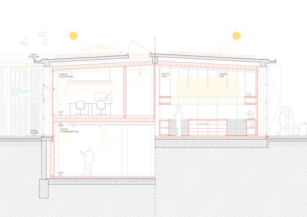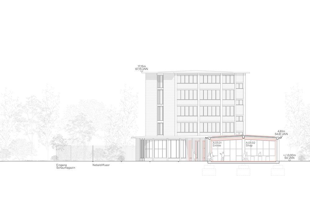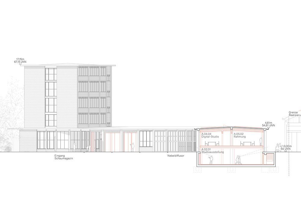 Die Durchfahrt zwischen Verwaltungsbau und Garagenkomplex wird beibehalten. Dort sind witterungsgeschützte Eingänge zum Schaumagazin verortet - von denen aus Besuchende in den großzügigen öffentlichen Bereich gelangen. Mitarbeitende gelangen zentral vom Foyer ins Hochparterre - dort sind gesichert Büros, Verwaltung, Forschung und Werkstätten. Über eine parallel nach unten verlaufende Treppe gelangt man in den Ausstellungs-/Programmbereich. Über das Forum gelangen geführte Gruppen in die Schausammlung 1. Es wird eine eigenständige Zugänglichkeit jedes White-Cubes vom Flur aus gewährleistet. Geometrisch ausgewogene Raumzuschnitte ermöglichen eine flexible Bespielung. Die White-Cubes benötigen eine Abschirmung gegen Tageslicht. Die jeweiligen Gebäude Längsseiten werden geschlossen und erhalten Spiegel. Somit wirken die Fassaden nicht opak, sondern spiegeln die Umgebung, Tageszeiten und Lichtstimmungen wider. Die süd-östliche Fassade wird als Kommunikationsfläche ausgebildet. Auf der inneren Wand aufgesetzte LEDs ermöglichen eine flexible dynamische oder auch statische Bespielung.